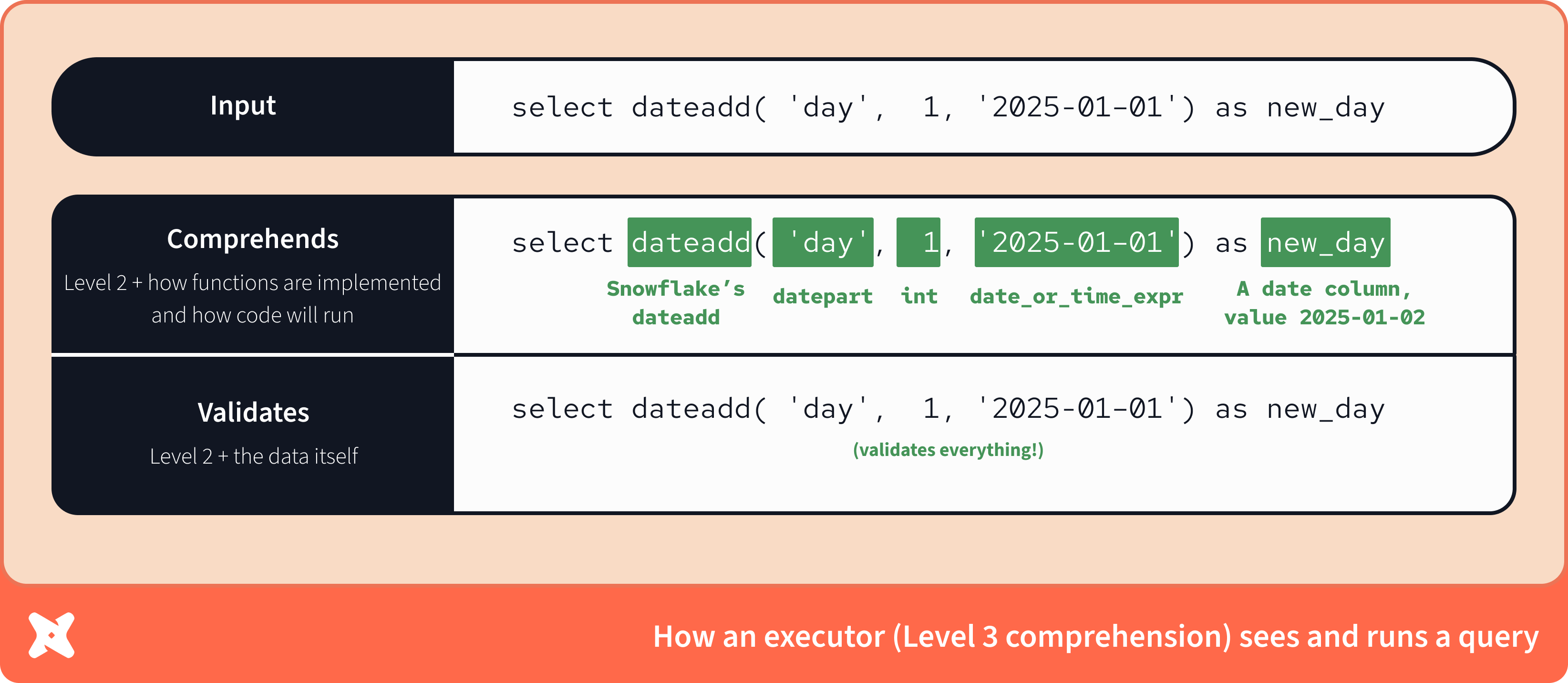 A tool with execution capabilities knows everything about this query and the data that is passed into it, including how functions are implemented. Therefore it can perfectly represent the results as run on Snowflake. Again, that’s what databases do. A database is a Level 3 tool.